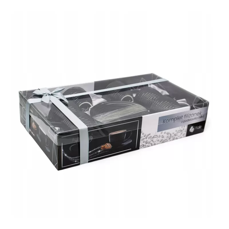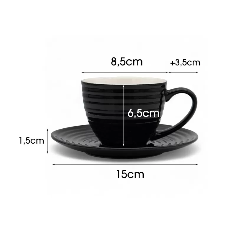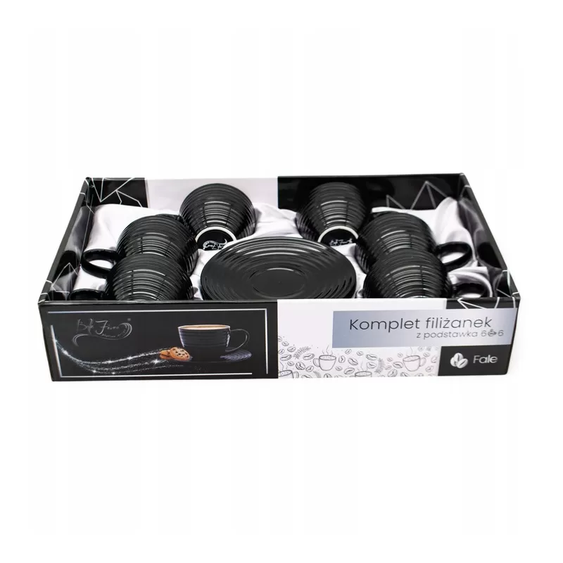Zestaw sześciu filiżanek o pojemności 220 ml każda, wykonanych z wysokiej jakości porcelany, łączy elegancję z praktycznością. Filiżanki w klasycznym czarnym kolorze z białym wnętrzem pasują do nowoczesnych i tradycyjnych aranżacji kuchni czy jadalni. Zestaw zawiera również dopasowane podstawki, a eleganckie opakowanie czyni go gotowym pomysłem na prezent.