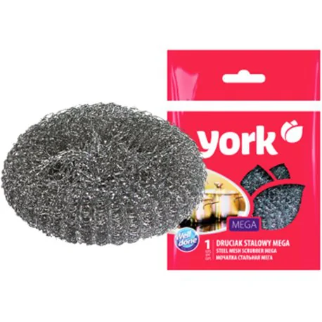 Metalowy czyścik marki York do czyszczenia naczyń, garnków i trudnych zabrudzeń. Bardzo trwały stalowy czyścik do usuwania uporczywych zabrudzeń. Powiększony rozmiar sprawdzi się podczas czyszczenia np. większych garnków. Skutecznie usuwa przypalone resztki, tłuszcz, rdzę. Nie nadaje się do czyszczenia teflonu.